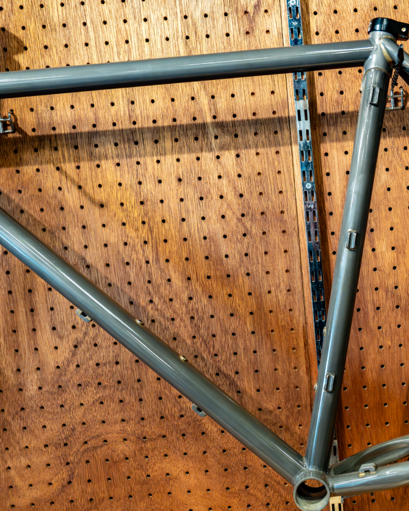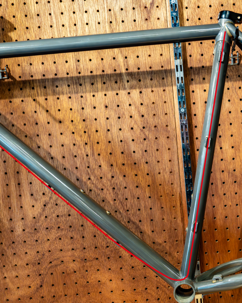 これは例えば、ですが、ドロッパーシートポストの外装式を取り付けるときのルーティンのように、シートチューブにディスクブレーキのアウターレストを溶接、そこからディスクブレーキのワイヤーに合流させるような形が綺麗かな、と思います。