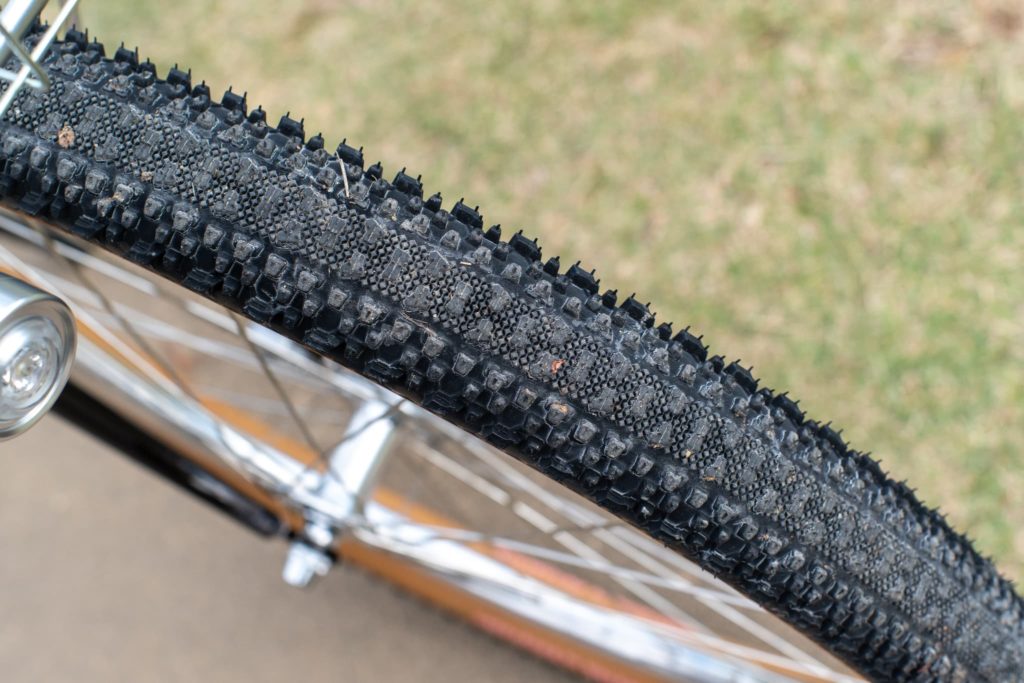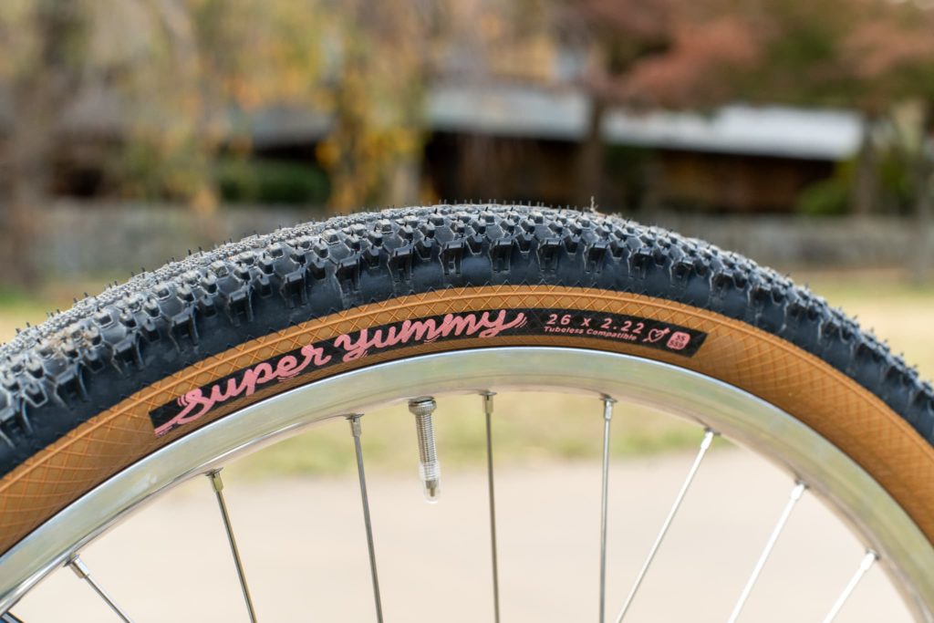 構成としてはフレームカラーにない方されているブラック基調、ブラウン基調をうまく展開、60mm近い太めのタイヤながら転がり抜群、山遊び、グラベルにもチャレンジできるクオリティのSuper Yummyのピーナッツバターサイドがめちゃくちゃハマってる!