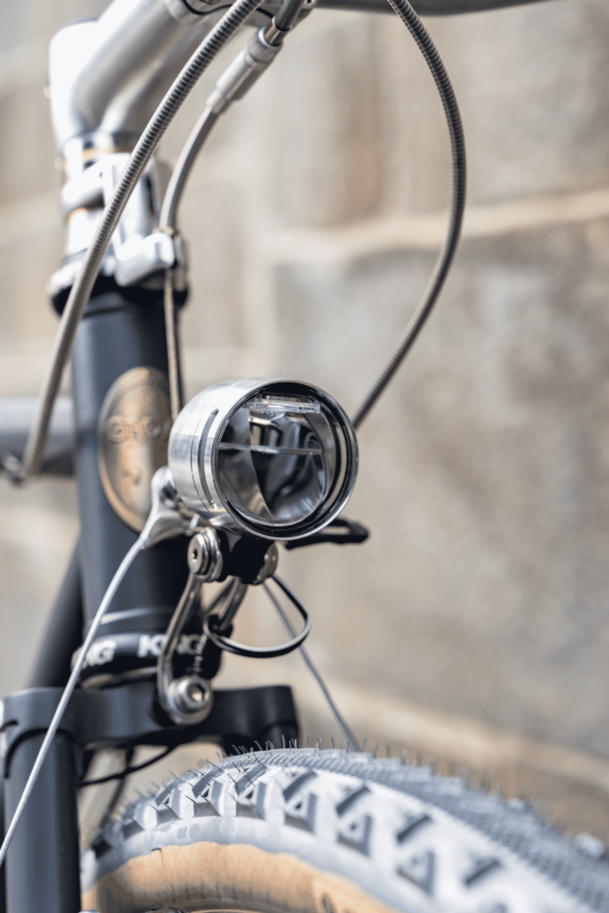 今回はフロントのダイナモコードをガイドに通して発電。