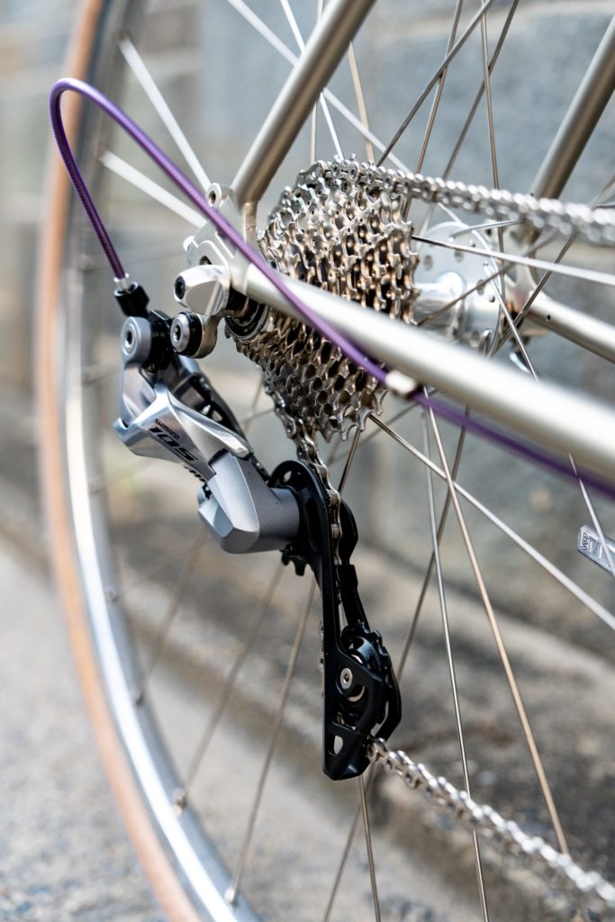 変速機は11速、R7000系のSHIMANO 105を採用していて、現行、ロードバイクパーツの中ではほぼ唯一と言っていいシルバー仕様です。